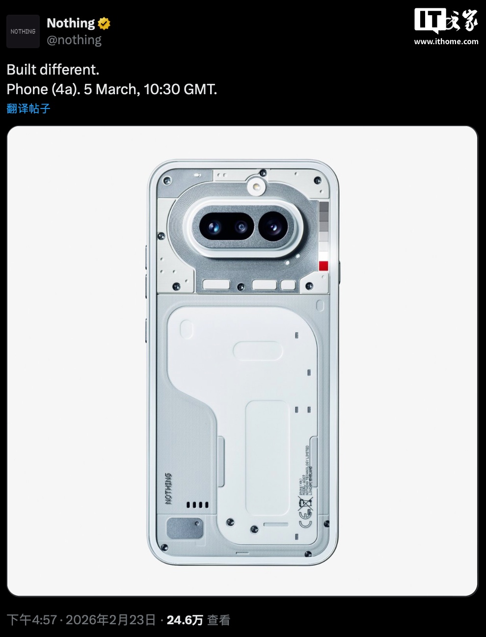 IT之家 2 月 23 日消息,Nothing 官方今天在 X 平台发文,公布 Phone (4a) 手机的外观。