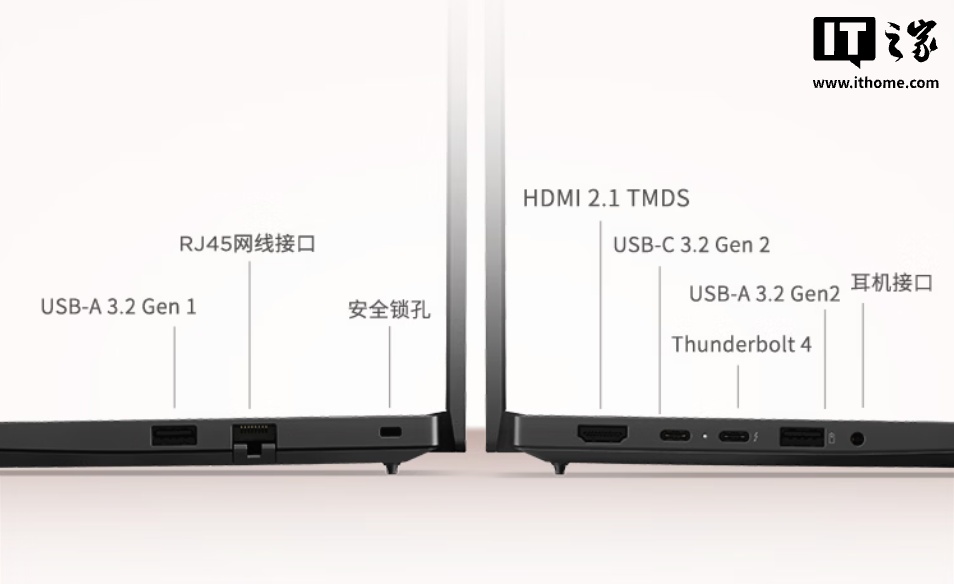 该机延续家族式设计,整体重量 1.34 Kg,厚度 15.3mm。笔记本 B 面配备一块 14 英寸 2880x1800 分辨率 120Hz 面板(亮度 400 尼特,覆盖 100% sRGB 色域);C 面使用防泼溅键盘。机身提供 1 个雷电 4、1 个 USB-C 3.2 Gen 2、1 个 USB-A 3.2 Gen 2、1 个 USB-A 3.2 Gen 1、1 个 HDMI 2.1、1 个 RJ 45、1 个 3.5mm 音频接口。