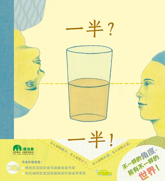 《一半?一半!》是一本简单的哲学启蒙读物。全书围绕“不一样的角度,就有不一样的世界”这个主题,希望教会孩子换位思考。本书述说因时间、空间和立场的差异,我们看事物会不一样。房子,对有的人来说是大,但对另一个人而言是小;爬楼,对有的人而言很简单,对身体不便者而言却很困难。难易、大小、美丑等都没有绝对的标准。事物所呈现的差异,是因大家看待的视角以及评判的标准不同。
