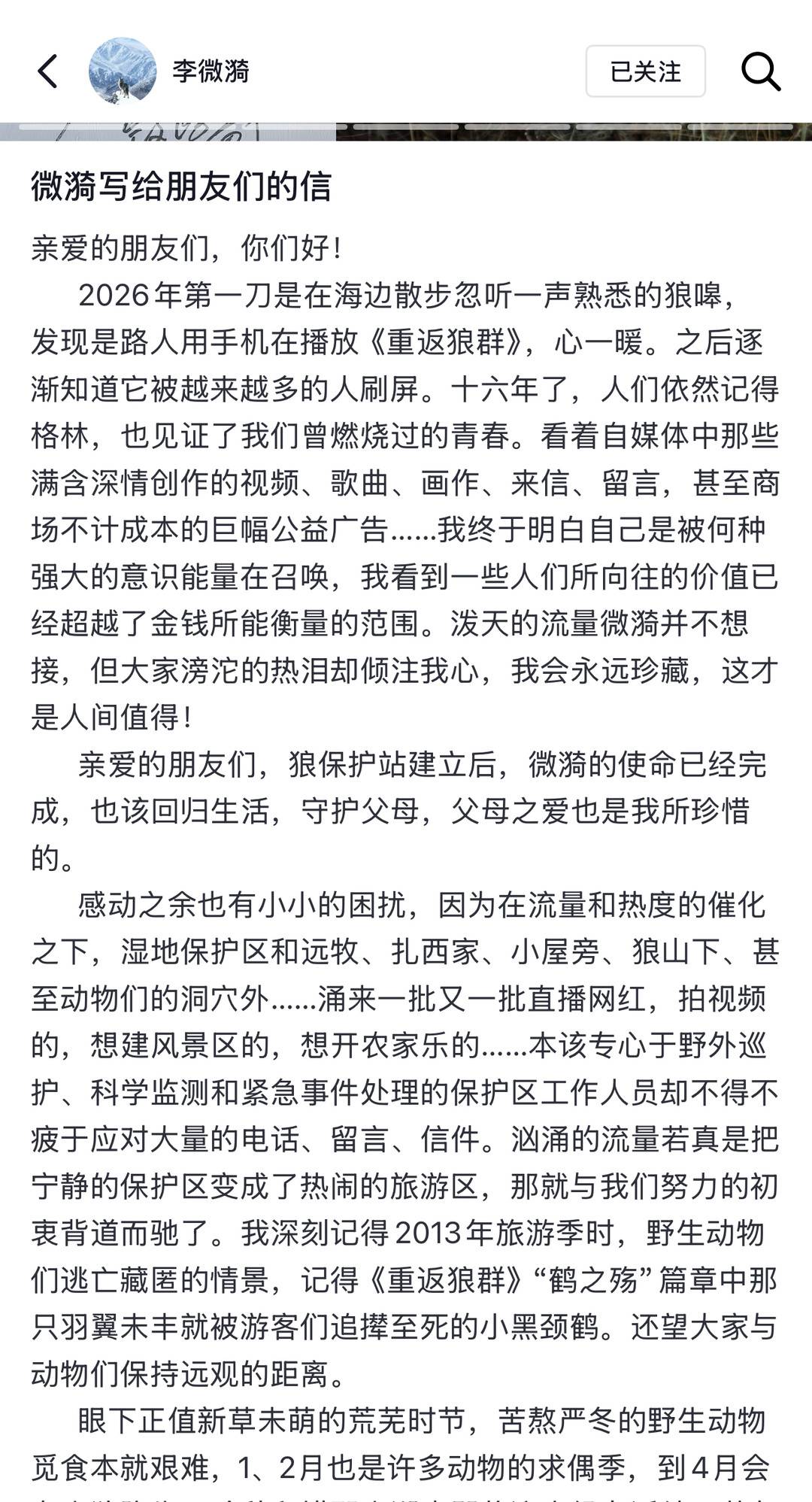 李微漪的长文中,也提到近期“格林”热让一批批直播网红涌入,给四川若尔盖湿地国家级自然保护区的工作人员的工作带来不便,也打扰了当地野生动物原本的生活节奏,“汹涌的流量若真是把宁静的保护区变成了热闹的旅游区,那就与我们努力的初衷背道而驰了”。她也发出呼吁:“此时不去打扰是我们最温柔的祝福。朋友们能否换一种方式去陪伴格林呢?把爱意藏在心里,把空间还给自然。”