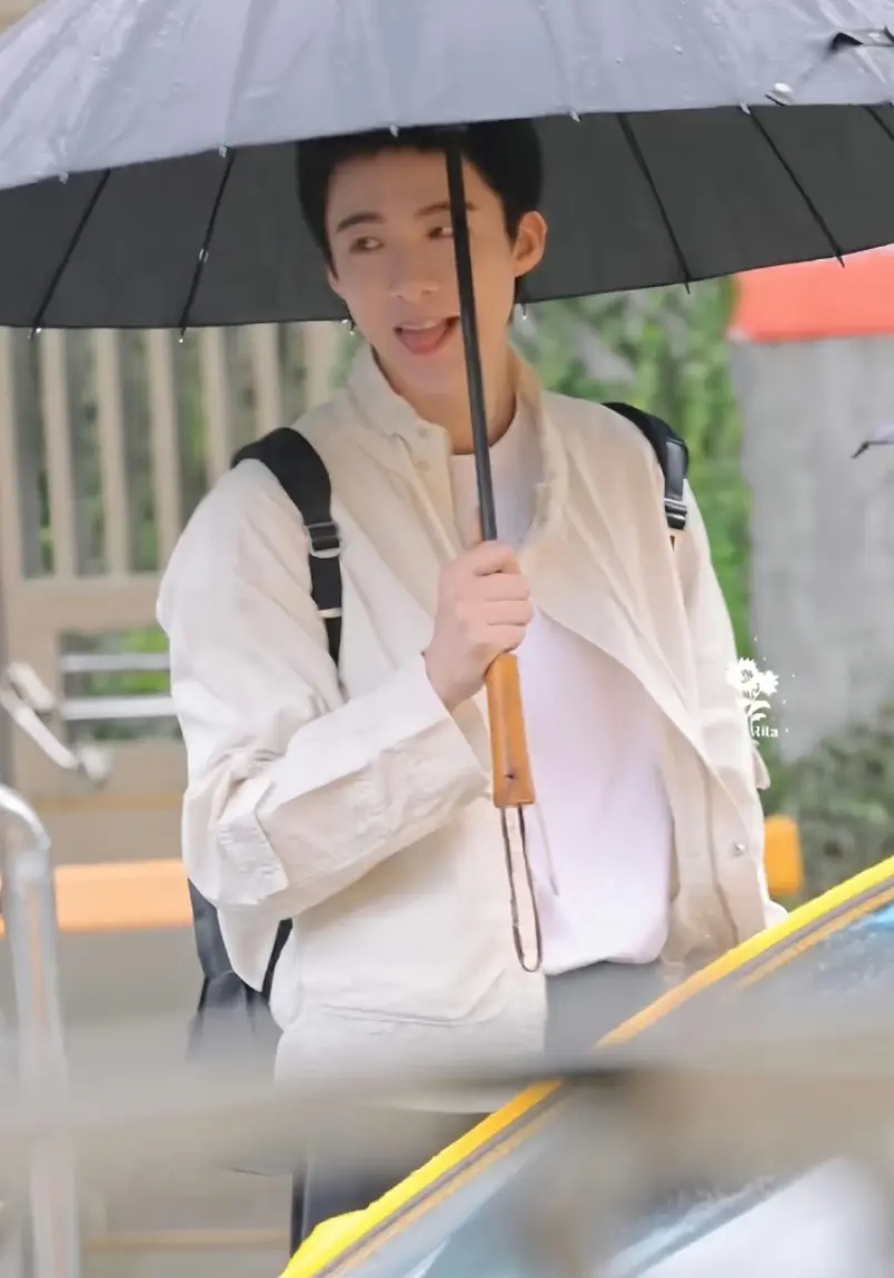 他先微蹙眉头,认真倾听,随即递出自己的伞,当女孩以为计划得逞时,他又从容地从包中又掏出一把伞。